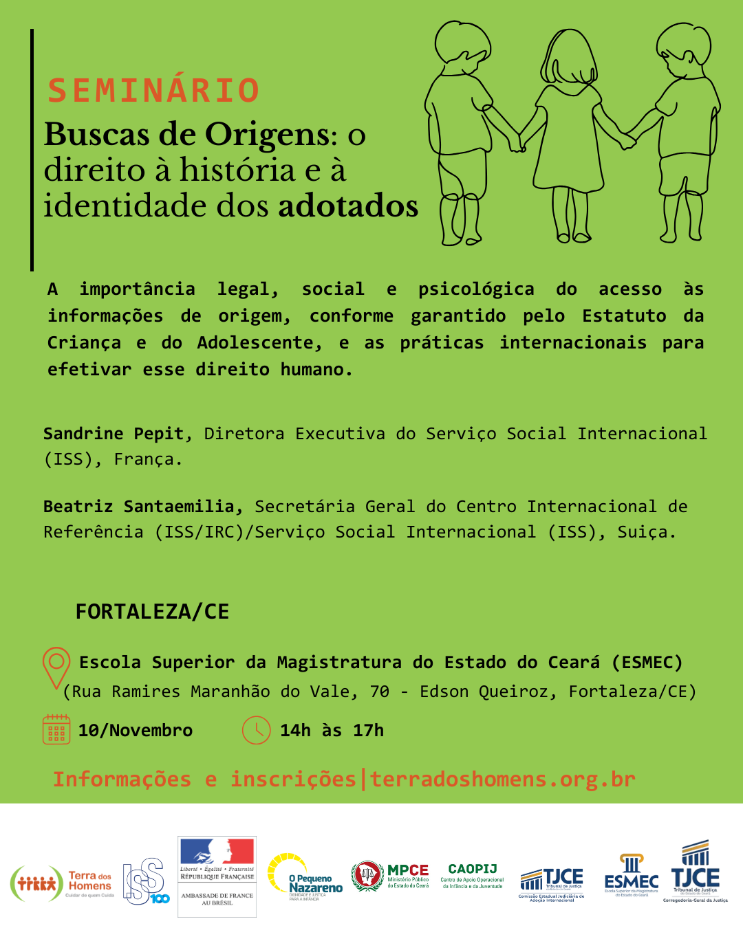 O Tribunal de Justiça do Ceará (TJCE) e a Associação Brasileira Terra dos Homens (ABTH) representante do Serviço Social Internacional (SSI), no Brasil tem a honra de convidar a comunidade jurídica, profissionais do serviço social, adotados, famílias e a sociedade em geral para o Seminário de grande relevância sobre o Direito à Origem Biológica.